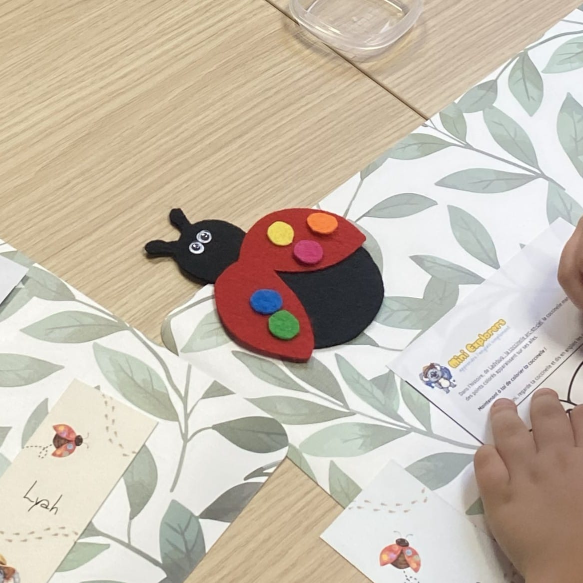 À chaque nouveau fruit, les enfants collaient un point en feutrine de la couleur correspondante sur leur petite Ladybug. 🍎🍓🍊